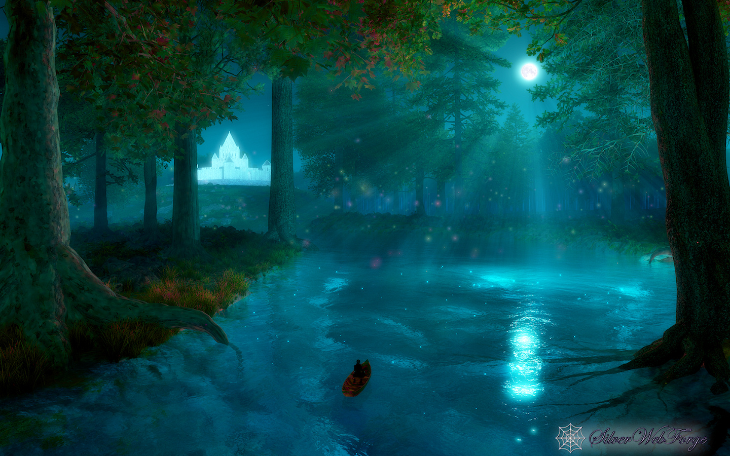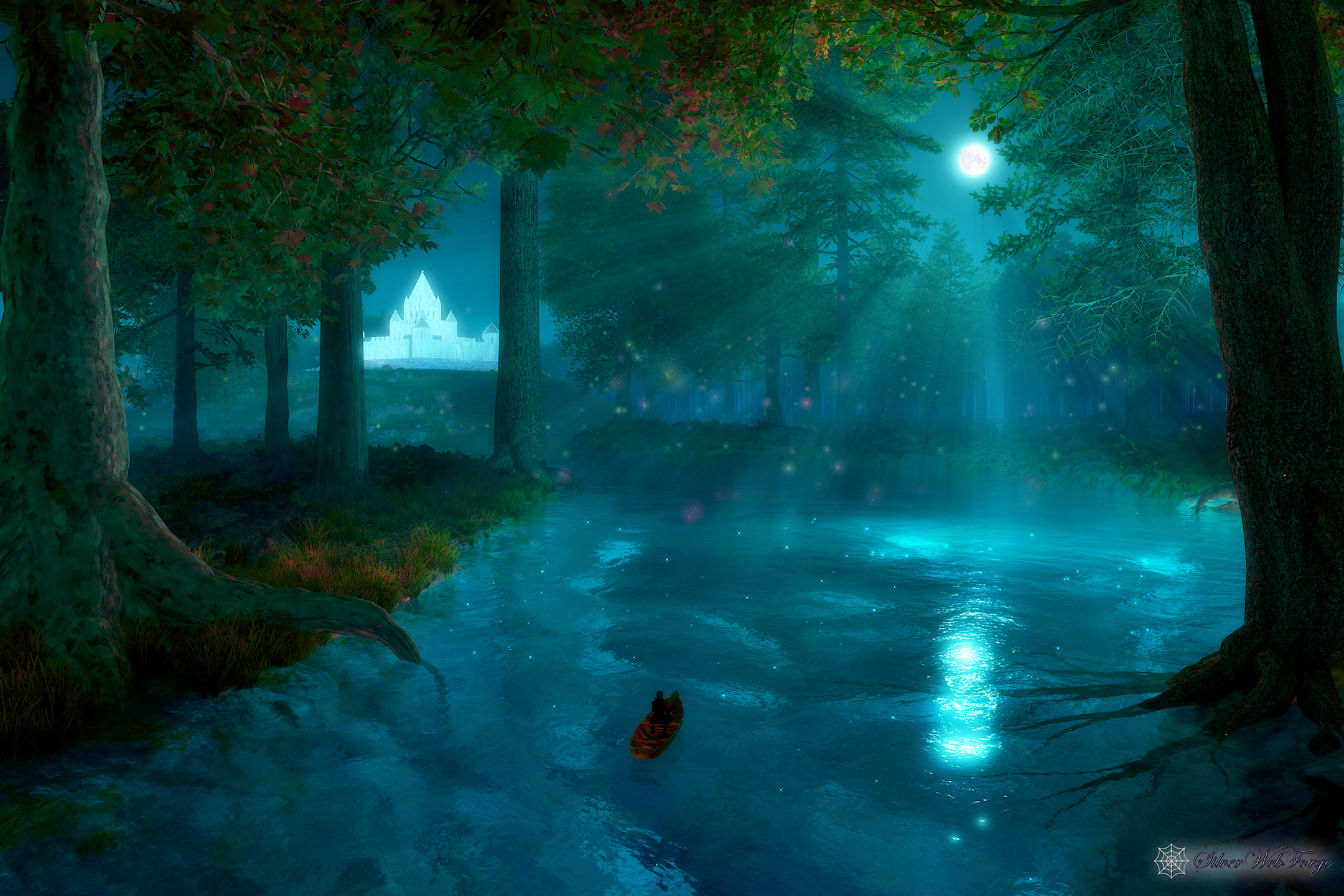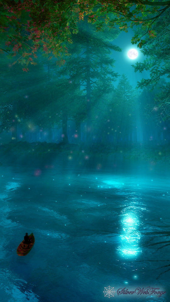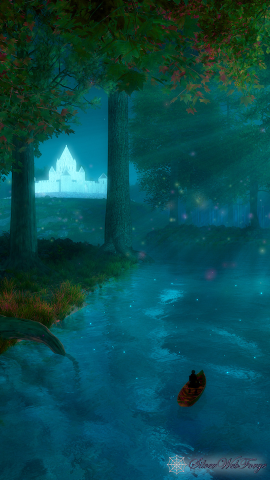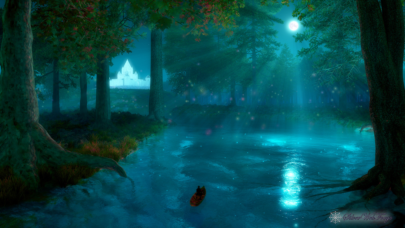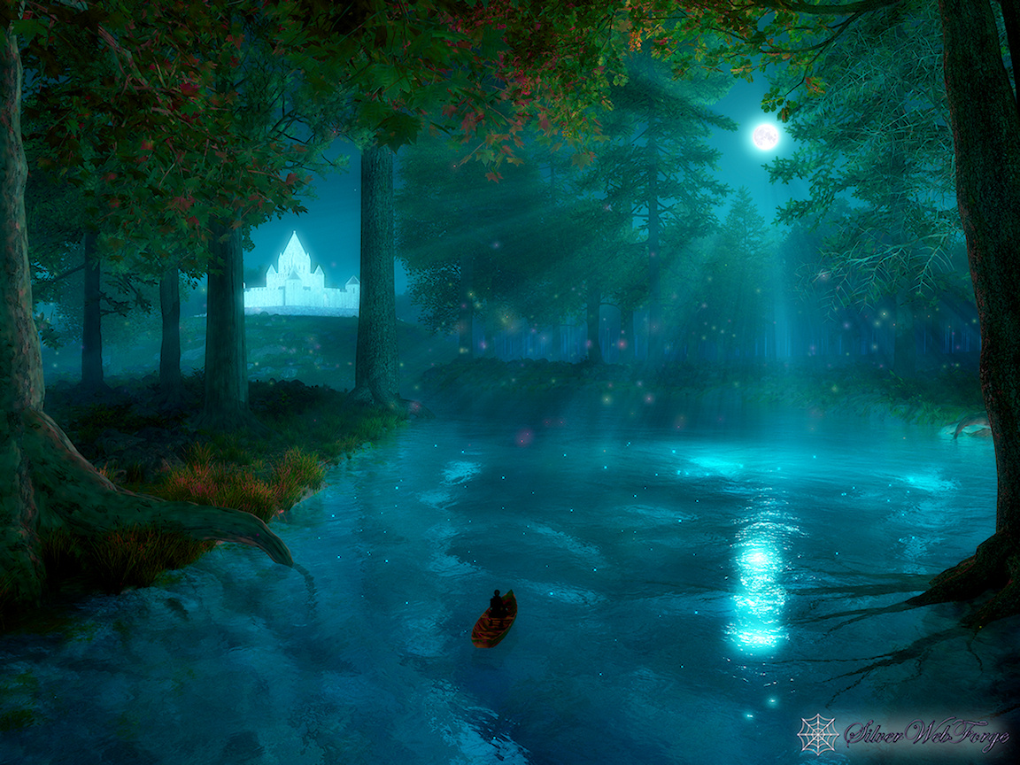 “I went on my silent path beneath a round silvery moon. And a pale moon looked up from the floor of the great blue cave that lay in the abysmal silence beneath. Gigantic forest trees were about me; through which, like a silver snake, twisted and twined the great river. The sleeping woods, in undefined massiveness; the water that flowed in its sleep; and, above all, the enchantress moon, which had cast them all, with her pale eye, into the charmed slumber, sank into my soul, and I felt as if I had died in a dream, and should never more awake. The stream bore my little boat with a gentle sweep round a bend of the river; and lo! on a broad lawn, which rose from the water's edge with a long green slope to a clear elevation from which the trees receded on all sides, stood a stately palace glimmering ghostly in the moonshine: it seemed to be built throughout of the whitest marble.”