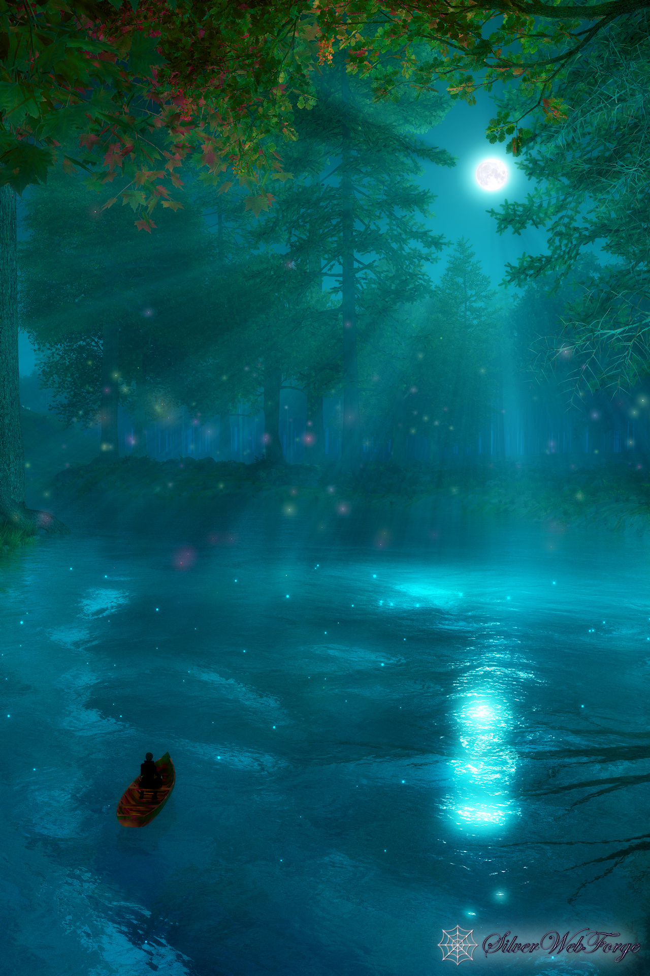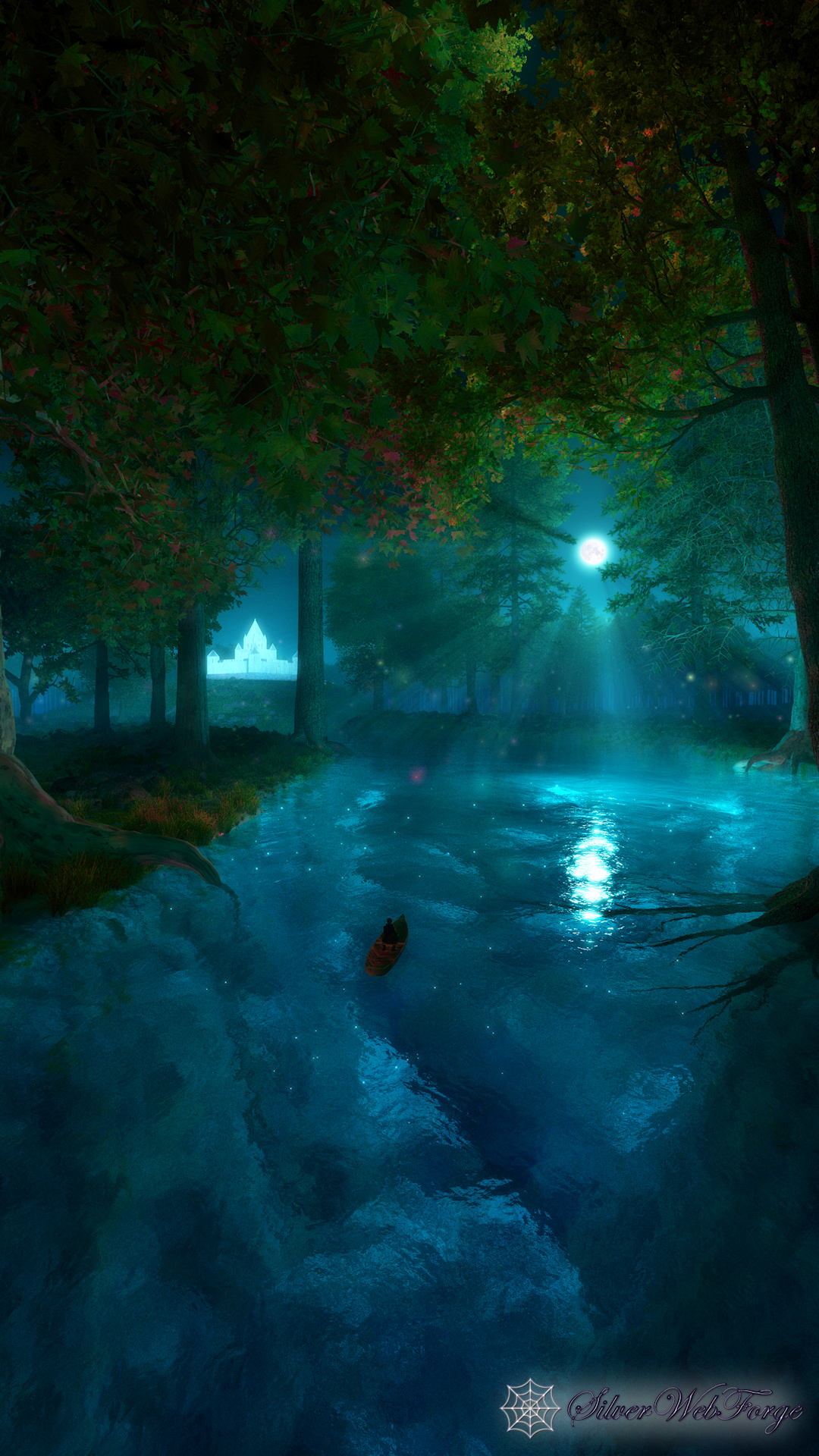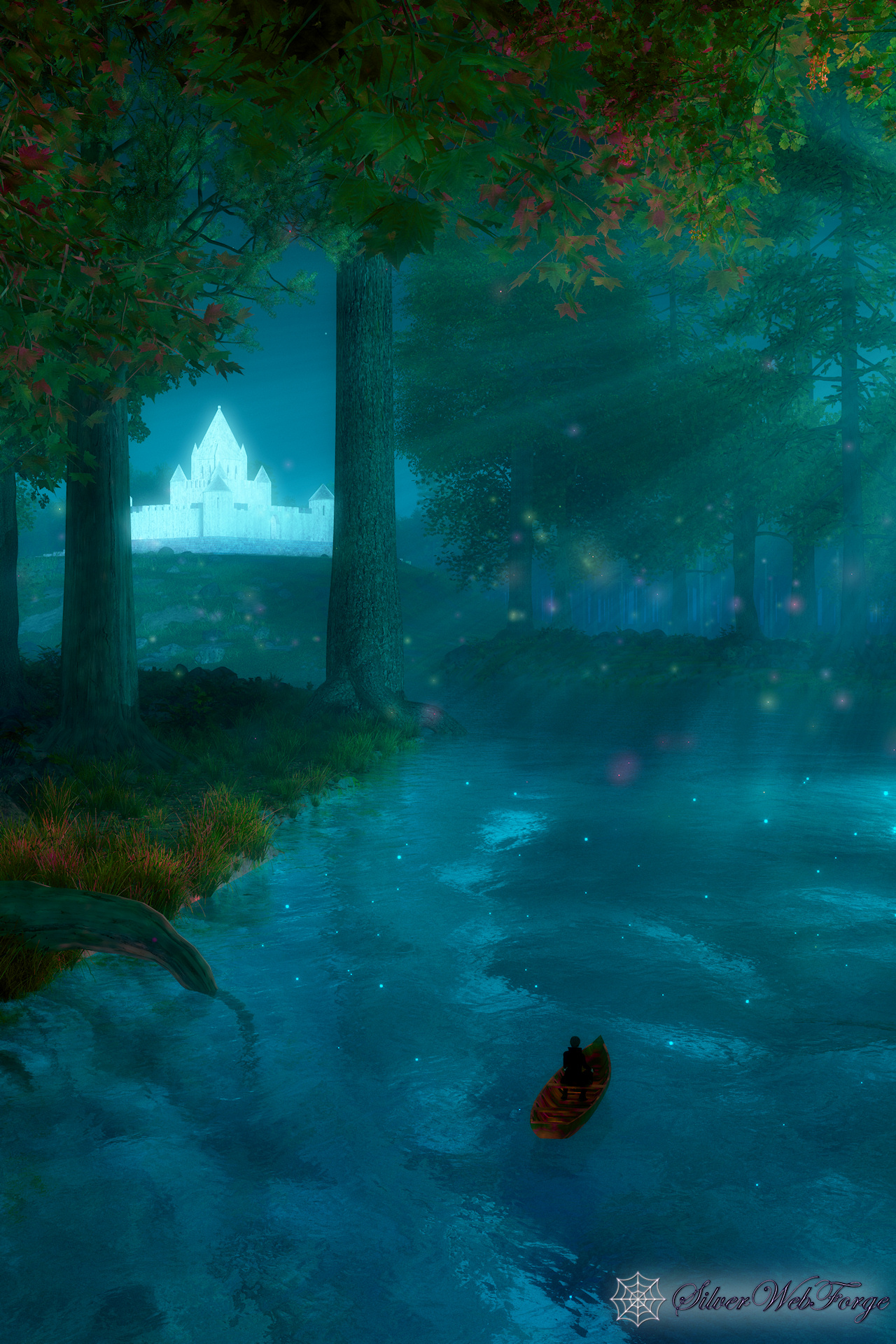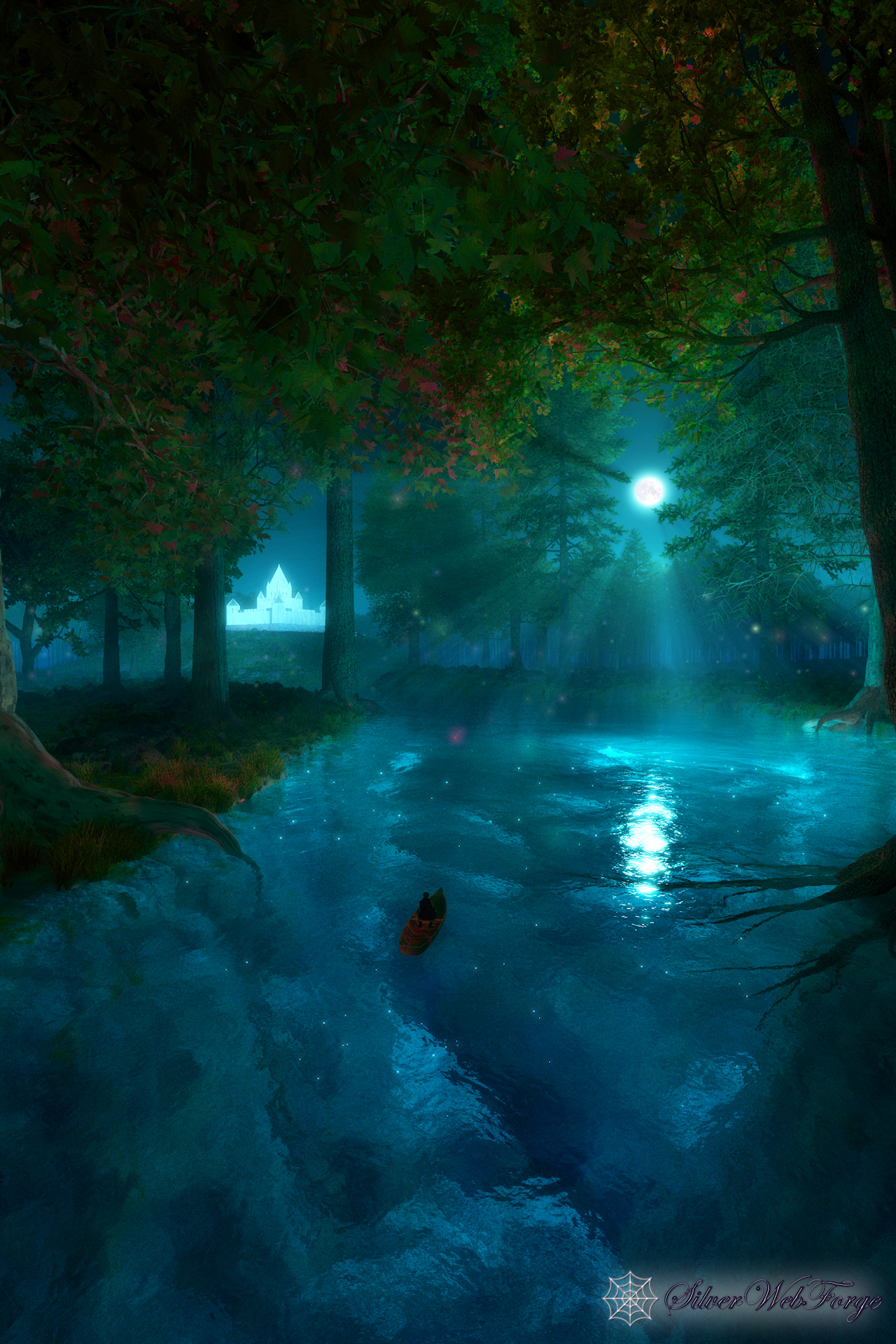 “I went on my silent path beneath a round silvery moon. And a pale moon looked up from the floor of the great blue cave that lay in the abysmal silence beneath. Gigantic forest trees were about me; through which, like a silver snake, twisted and twined the great river. The sleeping woods, in undefined massiveness; the water that flowed in its sleep; and, above all, the enchantress moon, which had cast them all, with her pale eye, into the charmed slumber, sank into my soul, and I felt as if I had died in a dream, and should never more awake. The stream bore my little boat with a gentle sweep round a bend of the river; and lo! on a broad lawn, which rose from the water's edge with a long green slope to a clear elevation from which the trees receded on all sides, stood a stately palace glimmering ghostly in the moonshine: it seemed to be built throughout of the whitest marble.”